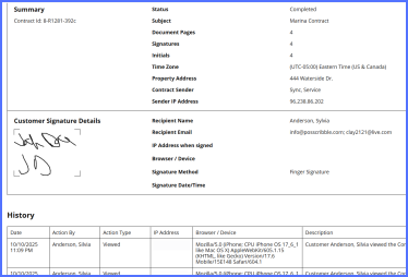 Every contract created automatically generates a summary document that includes key security details such as the contract ID, sender and signer information, and a complete history of all contract activity.